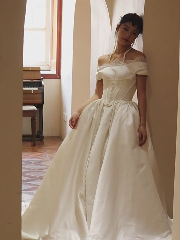 Crafted from the finest silk satin, Cendre exudes elegance and sophistication. The off the shoulder design with delicate laces adds a touch of sensuality, while the subtle ball gown allure creates a timeless look.
