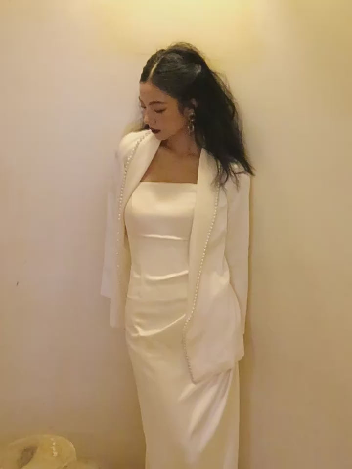 This refined collection pairs a freshwater pearl-hemmed jacket with architectural precision against a strapless maxi slip dress featuring fluid, draped lines.